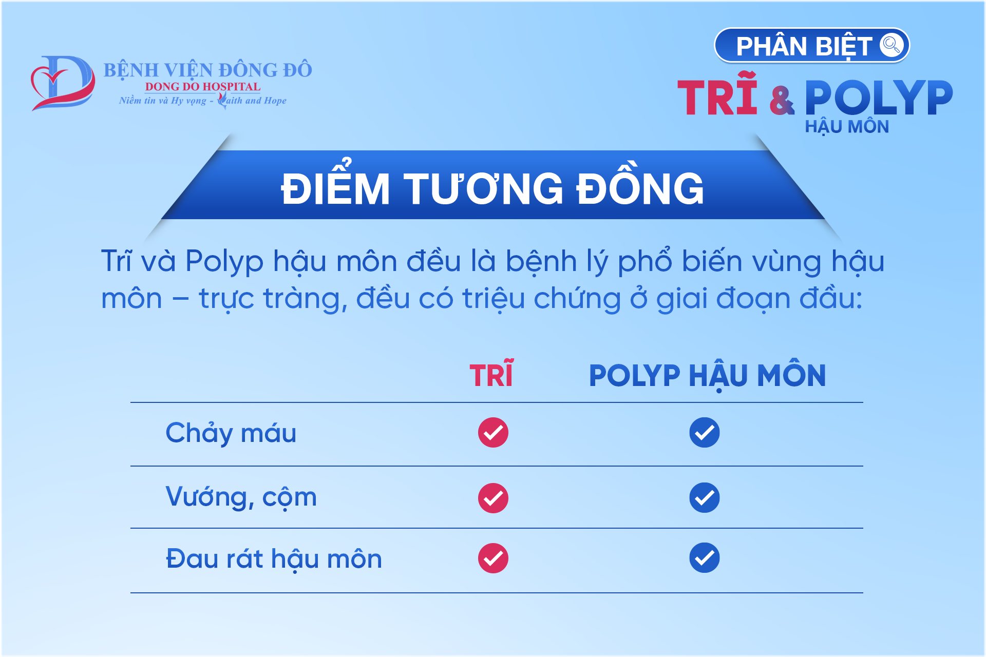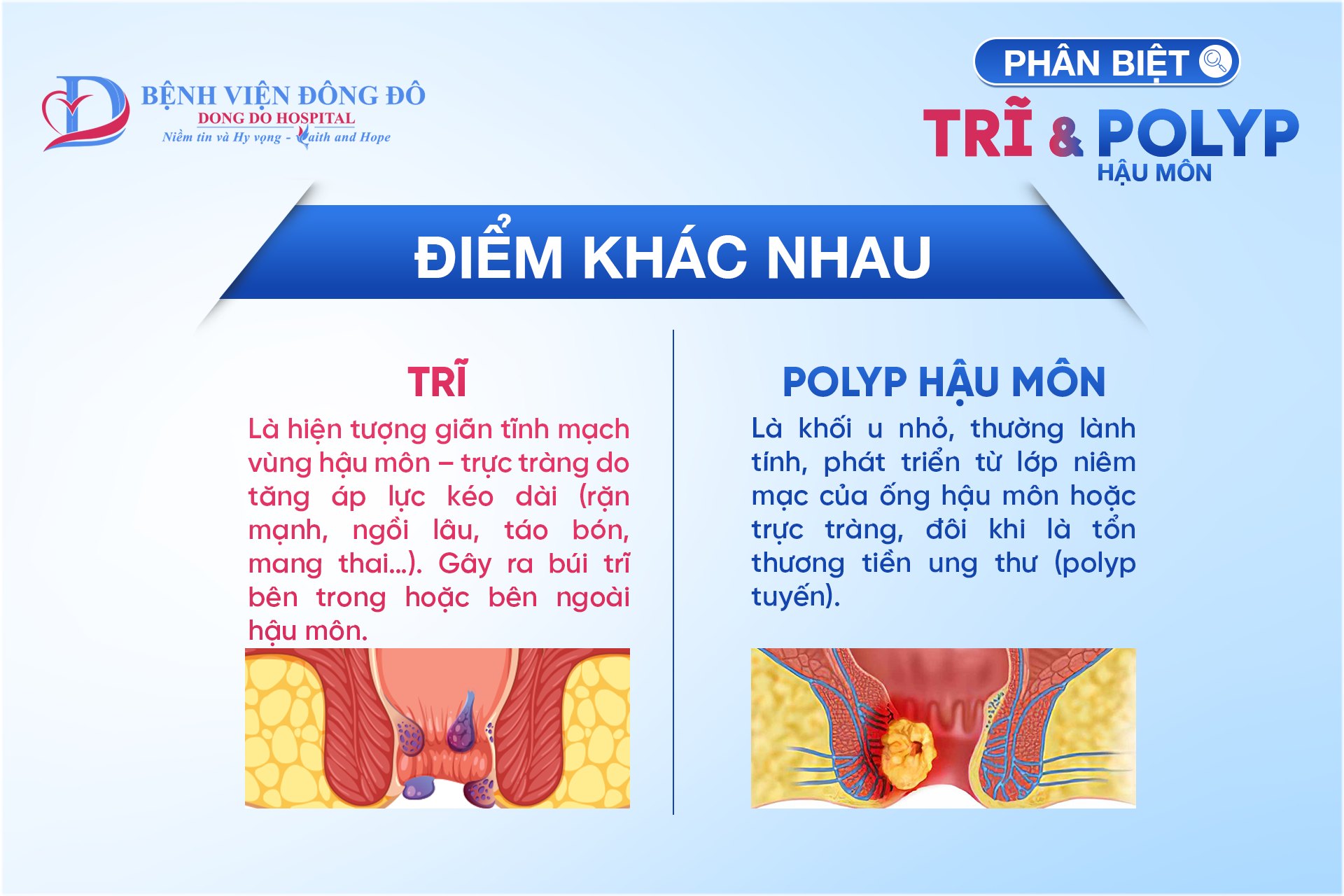 Tuy nhiên, đây là hai bệnh hoàn toàn khác nhau. Nhầm lẫn có thể dẫn đến điều trị sai hướng, tăng nguy cơ biến chứng nghiêm trọng, đặc biệt là với polyp – bệnh có thể tiến triển thành ung thư đại trực tràng.