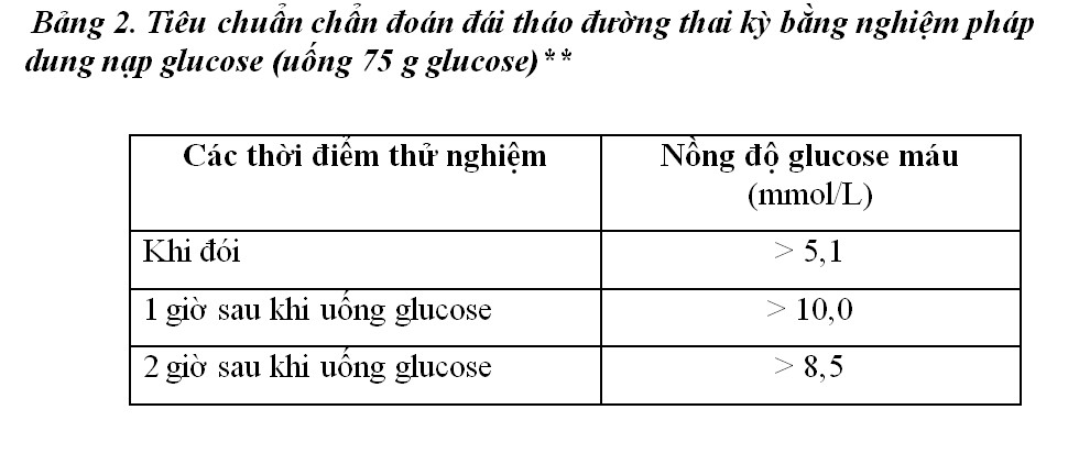 – Nếu một hoặc nhiều hơn các thông số ở bảng 2 lớn hơn giá trị nêu trên là đái tháo đường thai kỳ.