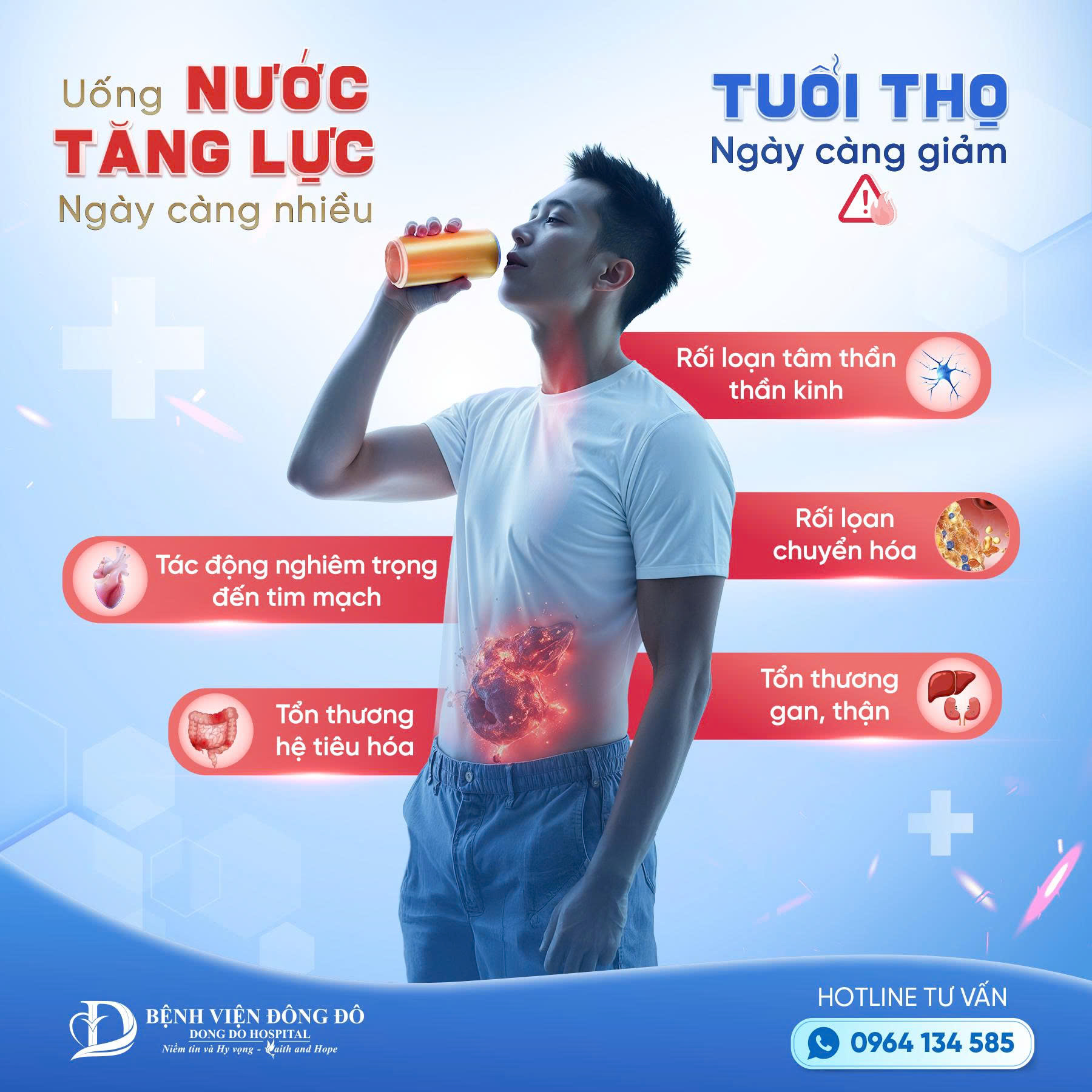 – Tác động nghiêm trọng đến tim mạch: Nước tăng lực thường chứa lượng lớn caffeine (80–300mg/lon), vượt xa mức khuyến nghị. Khi tiêu thụ quá nhiều: Gây rối loạn nhịp tim, tăng huyết áp, tim đập nhanh bất thường.