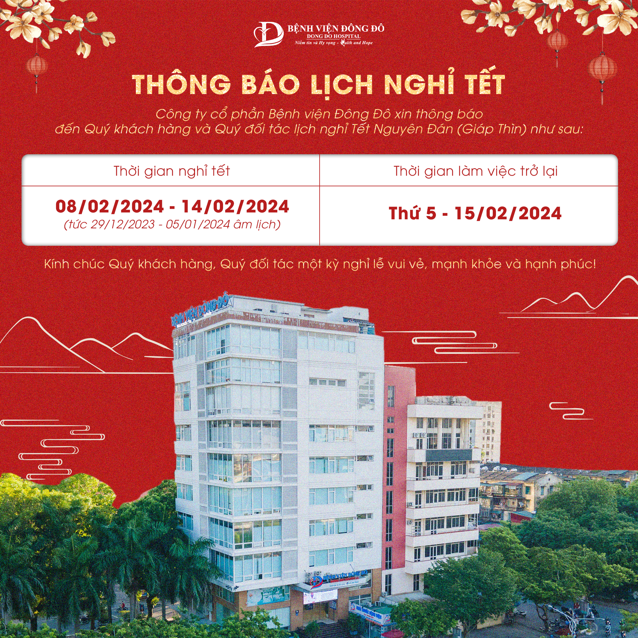 Bệnh Viện Đông Đô trân trọng thông báo đến Quý khách hàng và Quý đối tác lịch nghỉ Tết Âm lịch – xuân Giáp Thìn trong thời gian cụ thể như sau: